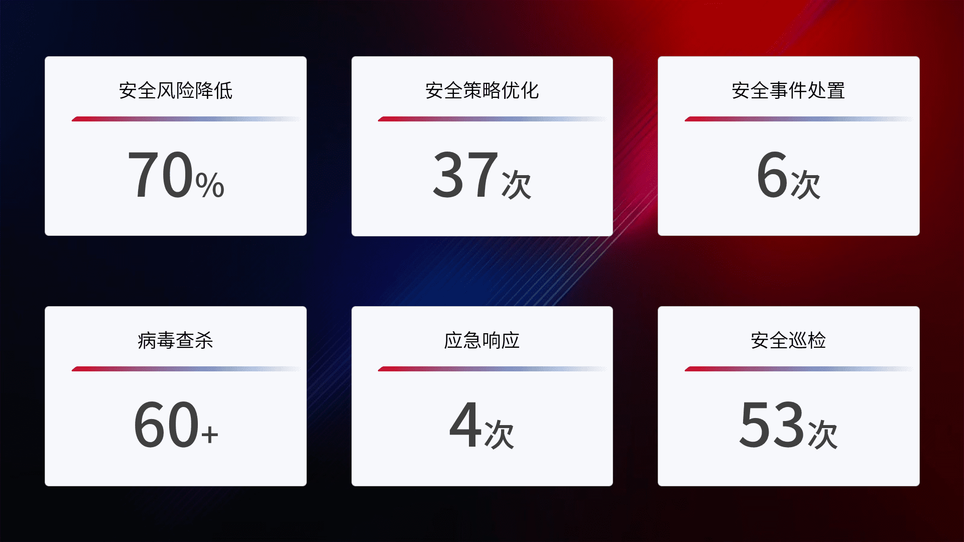 提供全面的安全事件报告体系,,包括处置报告、、、、周报、、、季度和年度总结,,结合持续监控,,帮助客户深入了解网络安全状况。。